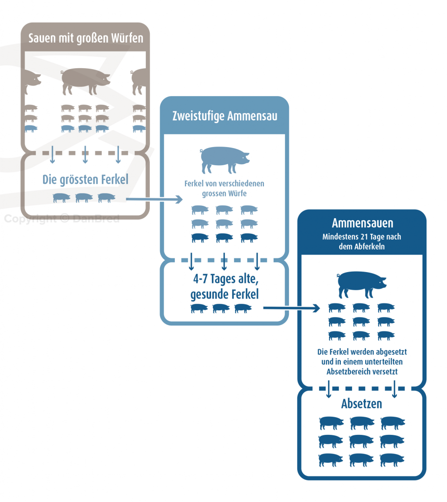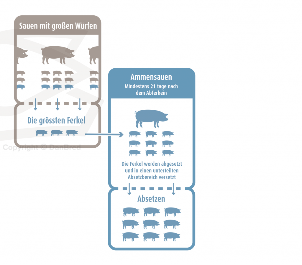 - Die vier bis acht Tage alten Ferkel werden zu einer neu abgesetzten Sau umgesetzt, die etwa 21 Tage nach dem Abferkeln ist (Sau Nr. 1).