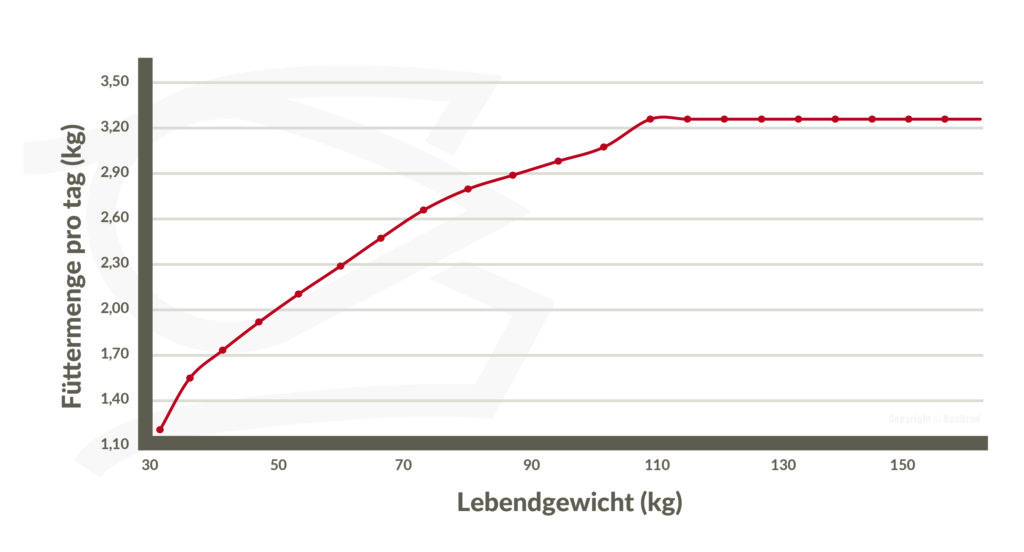 | Energiedichte pro kg Futtermittel | 13,0 MJ ME/9,8 MJ NE/1,07 EW | 12,8 MJ ME/9,7 MJ NE/1,05 EW | 12,7 MJ ME/9,6 MJ NE/1,04 EW | 12,5 MJ ME/9,4 MJ NE/1,02 EW |