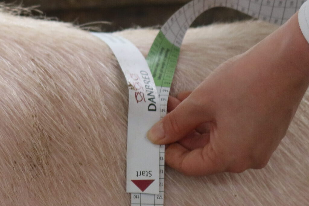 Das Gewicht der Jungsauen kann einfach mit einem Maßband überprüft werden, wenn keine Waage vorhanden ist. Dies ist eine sehr effektive Möglichkeit, das Wachstum zu niedrigen Kosten, einfacher Verwaltung und hoher Genauigkeit zu überwachen. Die Verwendung eines Maßbandes kann Ihnen sagen, ob Ihre Fütterungsstrategie funktioniert und Ihre Jungsauen Ihre Ziele erreichen. Wenn Sie den Umfang des Tieres direkt hinter den Vorderbeinen messen, können Sie entweder das Gewicht des Tieres berechnen – oder das Gewicht direkt ablesen, indem Sie das DanBred-Maßband verwenden, wobei das Gewicht und das empfohlene Gewicht bei der ersten Paarung direkt auf dem Band visualisiert werden.