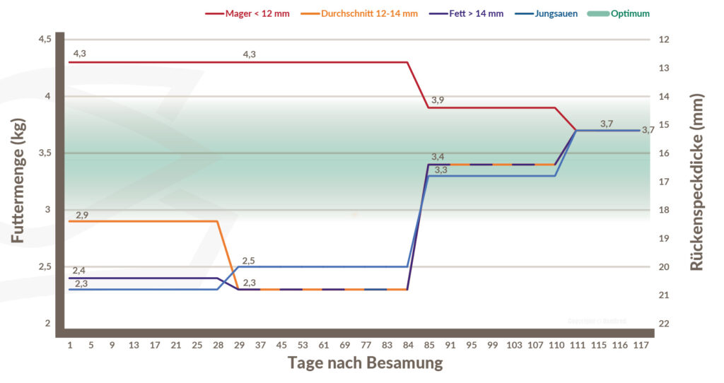 - Sauen, die in der vorangegangenen Säugezeit viel Gewicht verloren haben, verbrauchen mehr Futter. Wir empfehlen, die Wiederherstellung eines guten Körperzustands innerhalb der ersten vier bis fünf Wochen nach der Belegung.