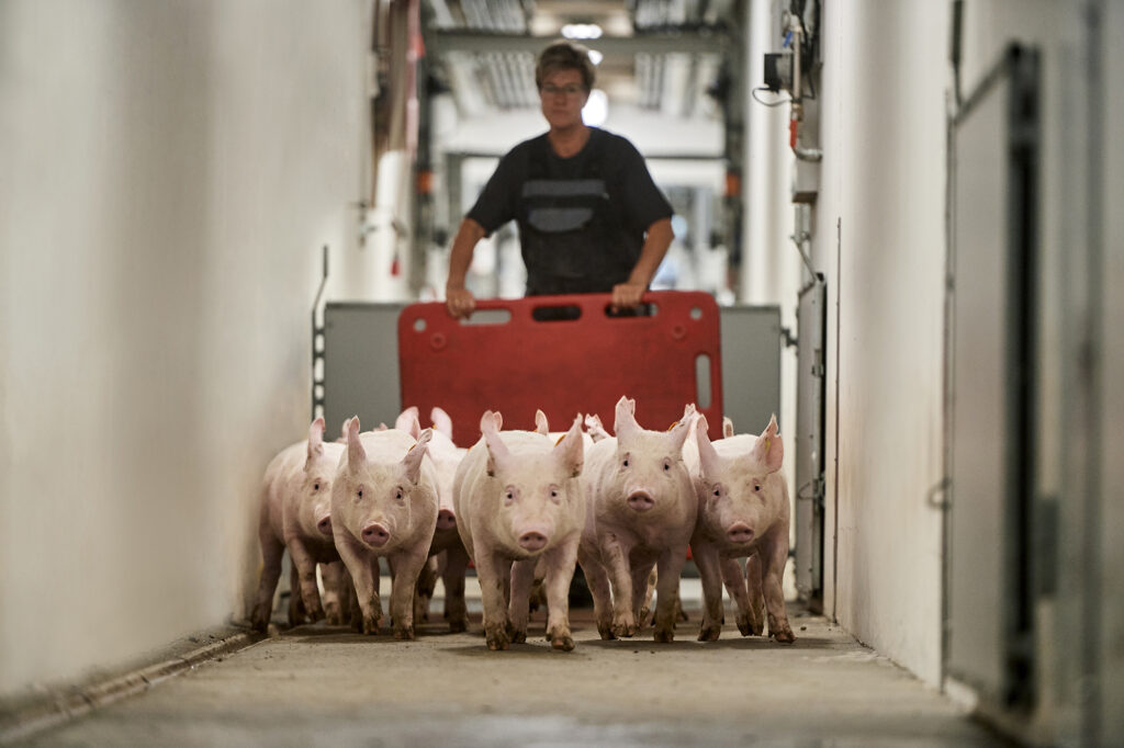 When checking the animals we recommend always going into each pen. This way the animals will get used to human contact, which will make daily handling of the sows and boars easier when they are introduced to the production facilities.