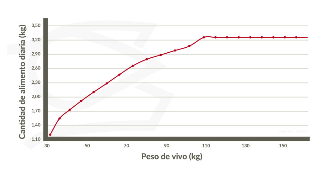 Curva alimenticia recomendada para las cerdas. La cantidad de alimento permitida se muestra en kg.