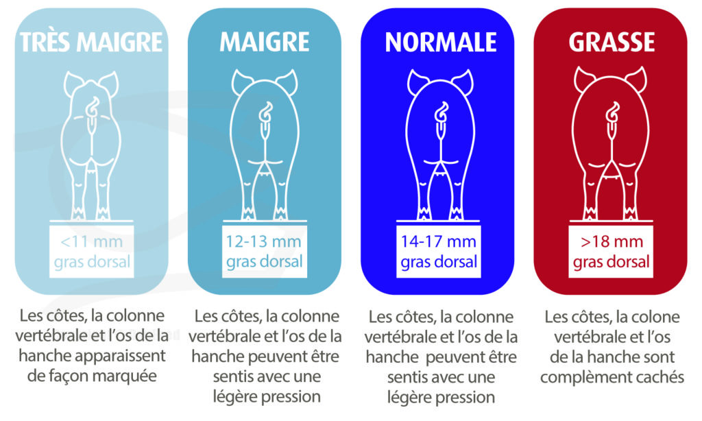 - Au sevrage ou à l’IA: cette évaluation permettra de déterminer quelle courbe alimentaire chaque truie doit suivre en début de gestation.