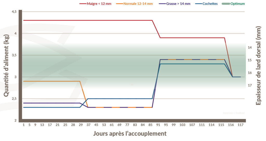 - Après 70 jours de gestation: cette évaluation montrera si la courbe alimentaire est optimale ou pas, et si les truies qui étaient maigres peuvent passer sur la courbe alimentaire moyenne.