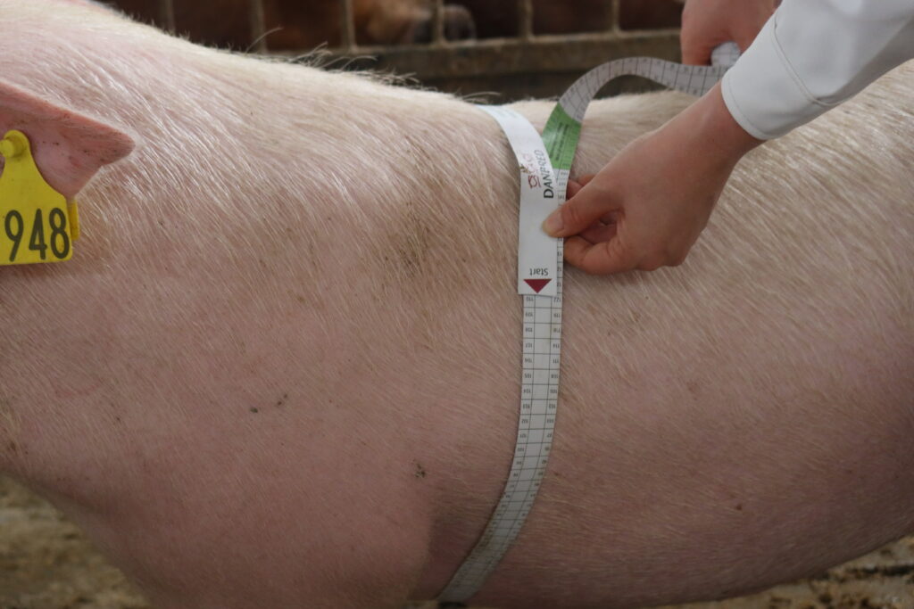 Le poids des cochettes peut être facilement vérifié à l’aide d’un ruban à mesurer si une balance n’est pas disponible. Il s’agit d’un moyen très efficace et peu couteux pour surveiller la croissance, facile à gérer et précis. L’utilisation d’un ruban à mesurer peut vous dire si votre plan d’alimentation fonctionne et si vos cochettes atteignent les objectifs. En mesurant la circonférence de l’animal juste derrière les pattes avant, vous pourrez soit calculer le poids de l’animal, soit lire le poids directement à l’aide du ruban à mesurer DanBred, le poids et le poids recommandé à la première insémination étant visualisés directement sur le ruban.