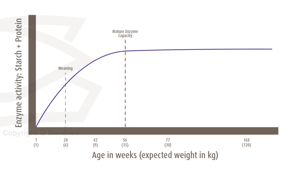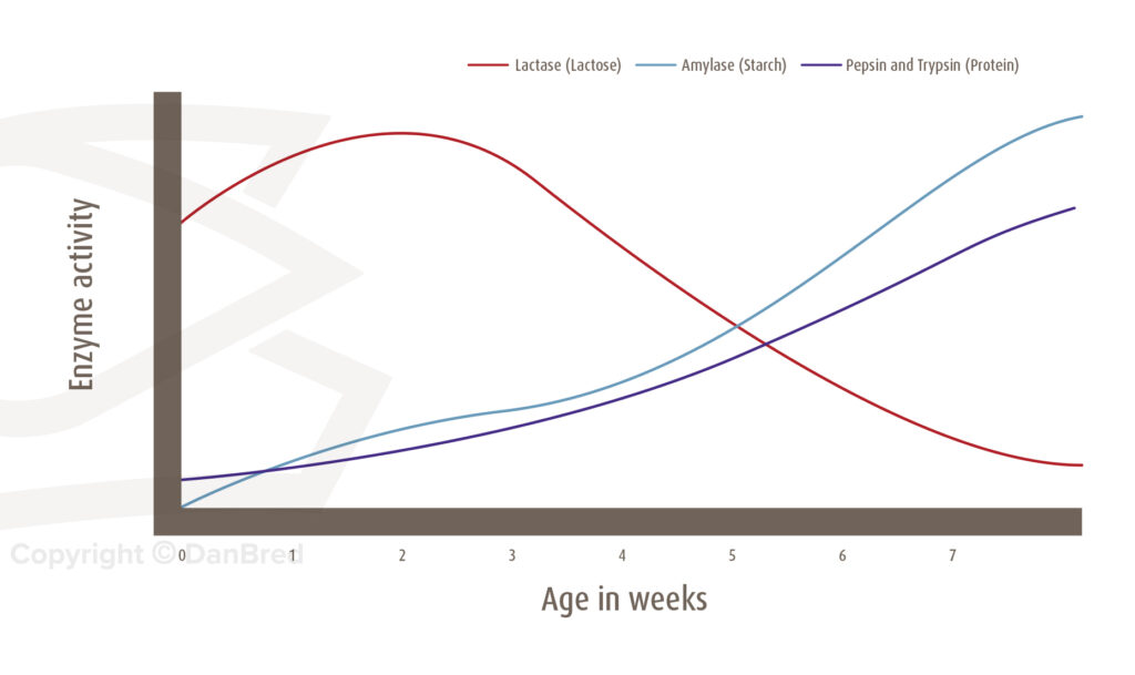 De big zelf ondergaat tijdens de groei een natuurlijke verandering in enzymproductie. In de onderstaande afbeelding wordt de ontwikkeling in enzymcapaciteit in de eerste levensweken weergegeven.
