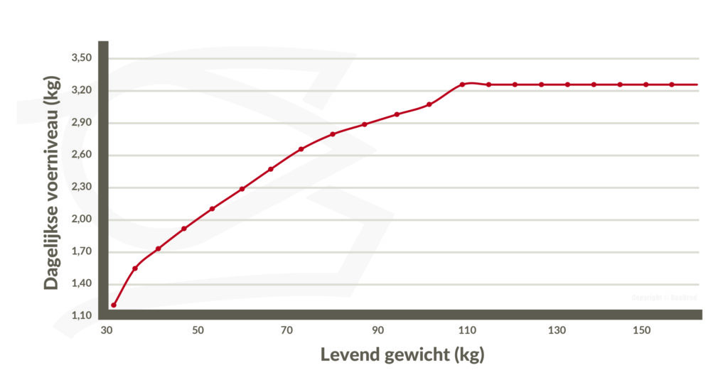 Het onderstaande figuur beschrijft het voeren van gelten tot aan de eerste dekking. Het doel van 13-15 mm rugspek bij dekking dient gedurende de gehele ontwikkelingsperiode gevolgd te worden. Gelten die rond de 90kg achterlopen, kunnen alvast worden overgezet naar het Gelten oer vanaf 110 kg ongeveer 3,25kg. |