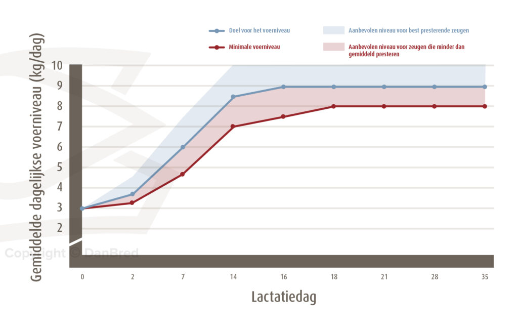 Nauwkeurige aandacht voor voer tijdens het zogen is essentieel om het volledige potentieel van het maximaliseren van de groei van de biggen te realiseren. Bovendien dient het voeren gedurende de gehele zoogperiode resp. lactatieperiode ervoor te zorgen dat het gewichtsverlies niet lager wordt dan een niveau dat van invloed zal zijn op het optimale interval spenen dekken, evenals op de worpgrootte van volgende worpen. De DanBred zeug is zeer robuust waardoor een gewichtsverlies van tussen de 5 en 20 kg geen effect heeft op de volgende lactatie. Een hoge mate van gewichtsverlies vereist later herstel.