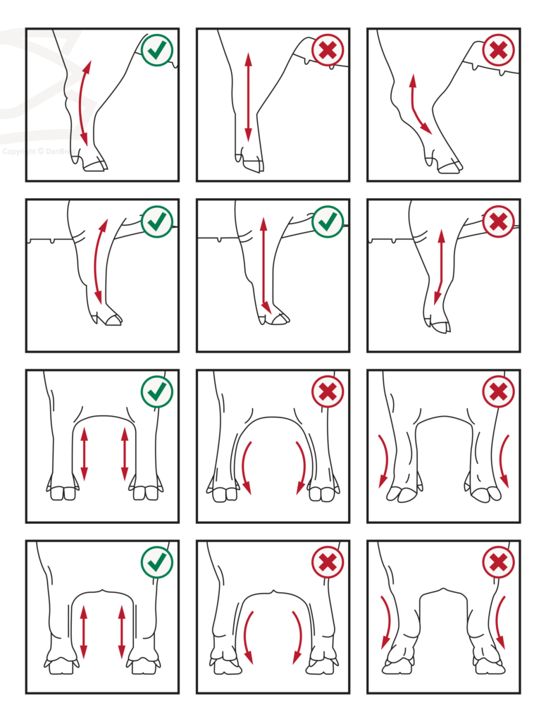 ** Forskellene på korrekt benstilling, og få uønskede kvaliteter på benstilling. Tabellen skal læses fra venstre mod højre, hvor de første tre linjer viser forbenene, og den sidste linje viser bagbenene.
