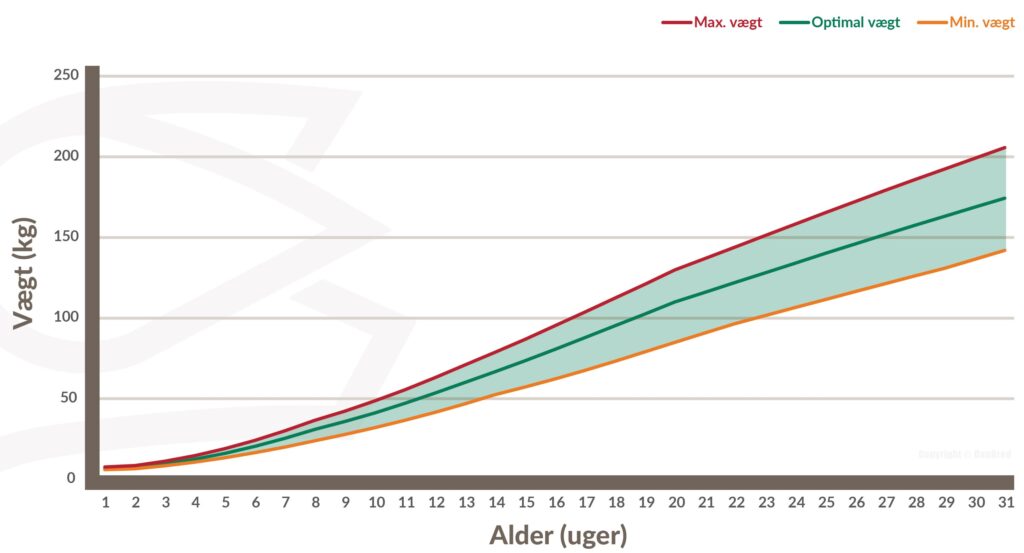* Avlsdyrene bør følge den optimale vægtkurve, og holde sig inden for det skraverede vægtinterval, med så lille variation som muligt. Se detaljer omkring optimal vægtkurve her – og detaljer om minmumsvægt her.