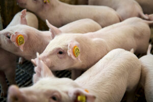 Yorkshire polte samlet i én sti – racen er her markeret med en orange plade under CHR øremærket, hvilket ligeledes er med til at skabe øget fokus på avlsdyrene i besætningen.