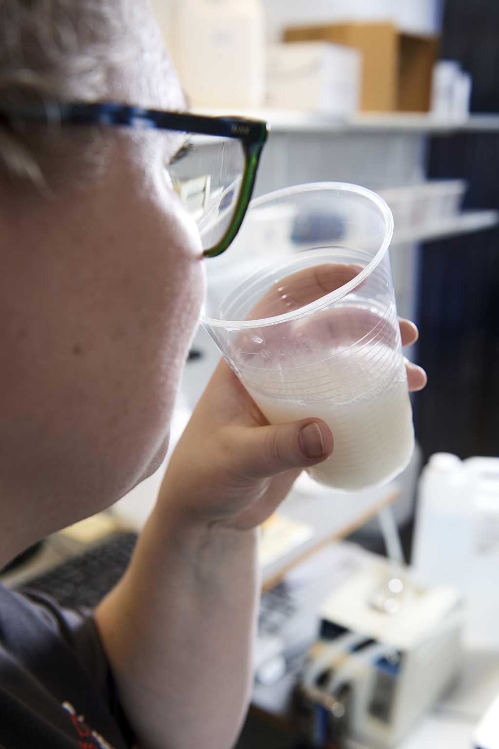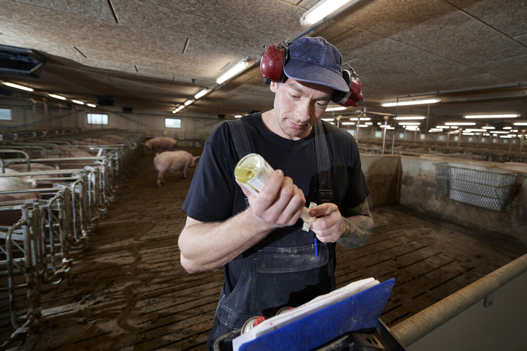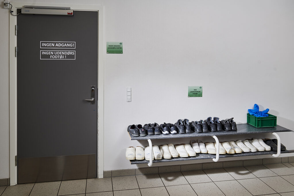 To prevent contamination the pig pens and the laboratory need to be clearly separated. Make sure that the lab itself is a clean zone, where boots and clothes worn in the sty are not allowed. Wash and disinfect your hands and, if necessary, change into a clean set of clothes.