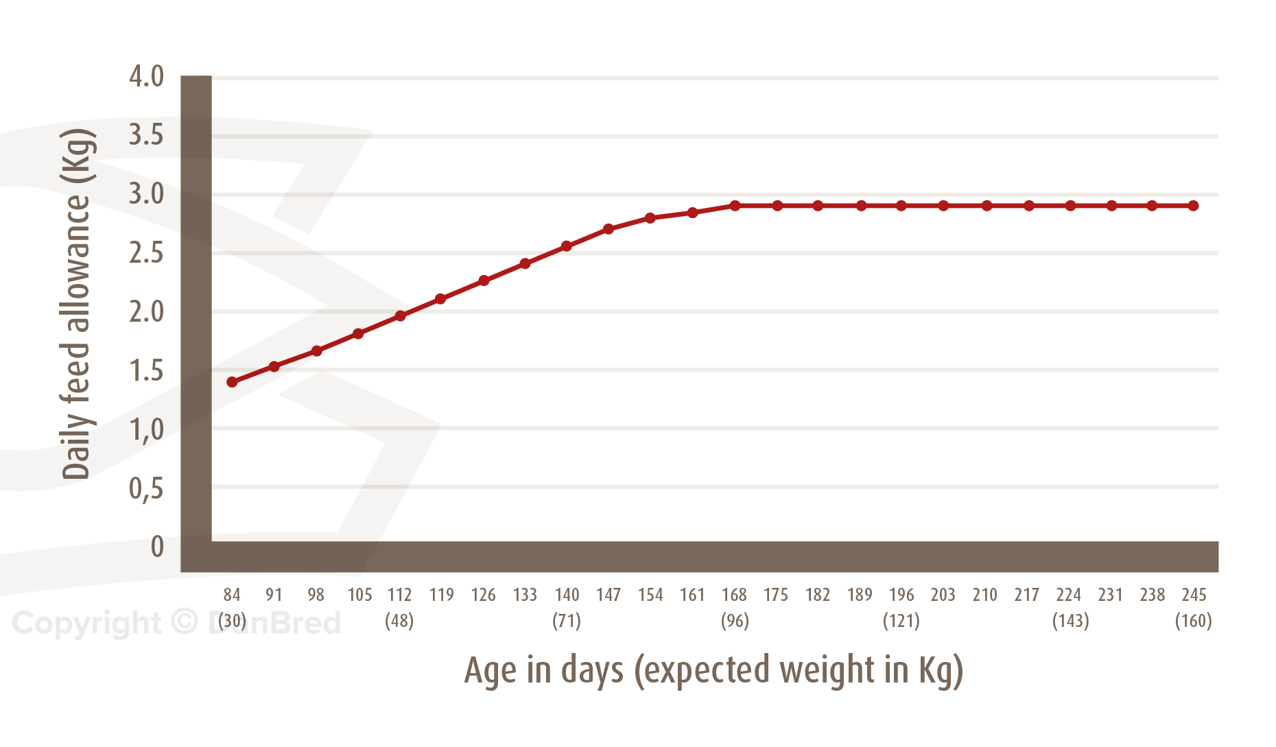DanBred recommends following a restricted feeding curve to control daily gain in the boars.